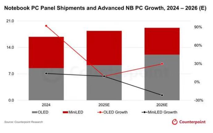 市場調查機構CounterPointResearch近日發布分析報告顯示,受企業設備升級、人工智能應用普及及新品持續推出等多重因素推動,全球筆記本電腦顯示器及面板市場將迎來穩健增長,其中OLED筆記本面板在2026年預計實現30%的同比增速,展現出強勁發展潛力。