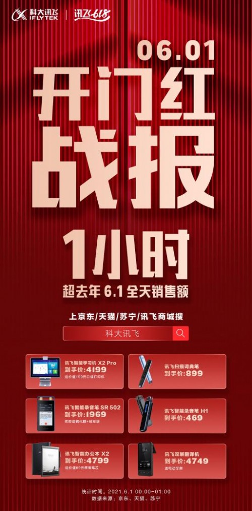 6月1日,618年中大促迎來開門紅,科大訊飛消費者產品開局即高能,1小時即超過去年6月1日全天銷售額,以其AI“黑科技”贏得了廣大消費者的芳心,一騎絕塵持續領跑,銷量一路飄紅,可謂首戰告捷。