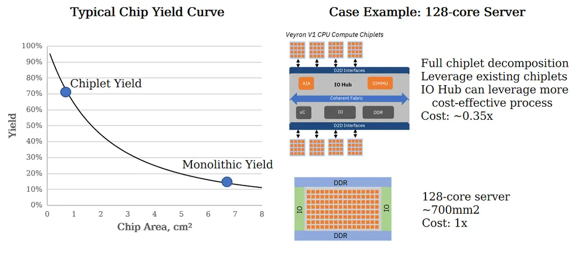 第二,Chiplet產品總體性能并不簡單等同于芯粒的堆疊規模,需要一套有效的D2D互聯架構及算法以實現高帶寬、低延時、低功耗,解決物理分離LLC的NUMA(非統一內存訪問),更進一步看,D2D互聯還需要形成行業標準,以實現不同廠商芯粒的互連互通;