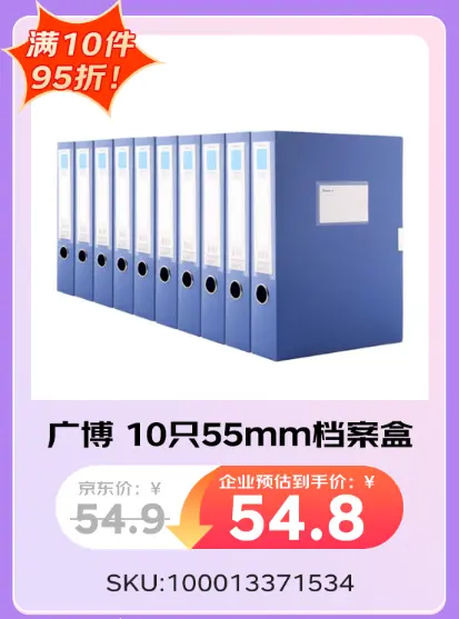 辦公紙質文件多且繁雜,若不能妥善放置將會造成查找麻煩、混亂等問題,辦公檔案盒的重要性就不言而喻。如廣博 10只55mm檔案盒擁有超大容量內存,存放空間大,適合多種文件資料存放;并采用PP材質,厚實堅固,持久耐用;以及索引標簽設計,可抽出便簽,方便記錄文件信息,查找便捷,能夠有效幫助企業員工有序存放文件。活動期間企業團購到手價僅需54.8元,降低企業客戶采購成本。