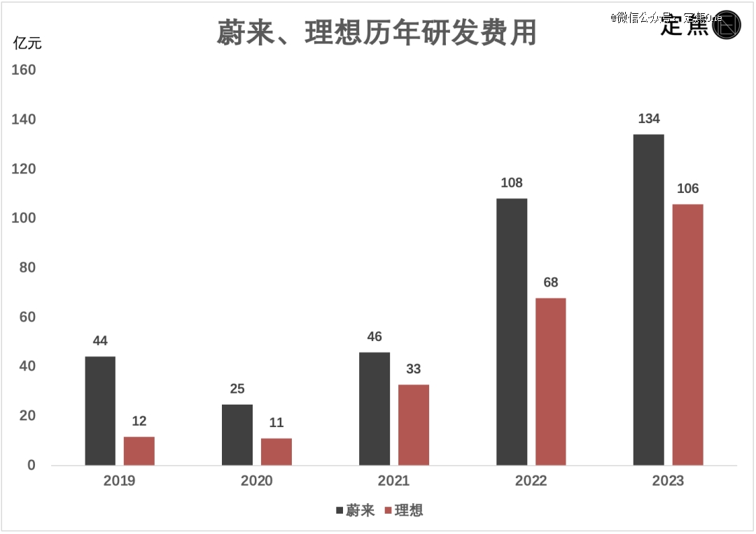 財報數據顯示,蔚來研發開支逐年遞增,2022年以前每年最高達到40多億元,2022年直接跳漲至108億元,2023年更是高達134億元。作為對比,理想在2023年大力推進研發,支出達到創紀錄的106億元,但還是跟蔚來有差距。需要注意的是,蔚來的收入不到理想的一半。