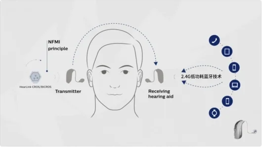 為了滿足單側全聾聽力損失用戶的需求,飛利浦HearLink40平臺助聽器配備CROS/BiCROS發射器,CROS發射器收集全聾側的聲音、無線傳輸至接收助聽器,從而使得用戶獲得全方位的聲音,提升單側聾患者的聆聽體驗。