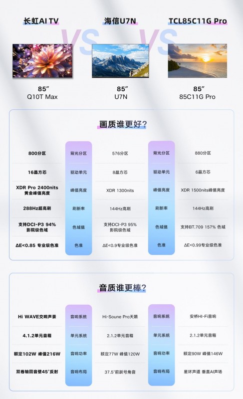 綜上來看,無論是海信U7N的音畫平衡表現,長虹AI TV Q10T Max的超高刷新率與亮度,三星85QNX9D的精準控光與立體聲場,還是TCL 85C11G Pro的極簡設計與出色音質,這四款電視都各具特色,滿足了不同消費者的需求。