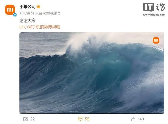 今日早間,小米公司、小米手機、小米汽車等多個賬號發布了一段海浪的視頻,并配文“謝謝大家”。