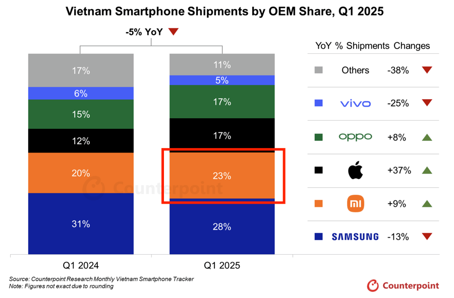 不久前Counterpoint發布最新數據顯示,在2025年第一季度,越南智能手機市場整體出貨量同比下降5%,但小米逆風增長,出貨量同比上漲9%,市場份額達23%,成為Top5中唯一正增長的品牌。