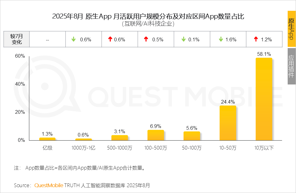 QuestMobile數據顯示,2025年8月,六成以上客戶端應用用戶規模在100萬以下,且暫未出現千萬以上體量客戶端應用。